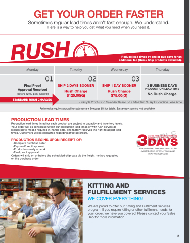 Production lead times listed for each product are subject to capacity and inventory levels. Your order will be scheduled within our production lead times or with rush service as requested to meet a required in-hands date. The factory reserves the right to adjust lead times. Customers will be contacted regarding affected orders.